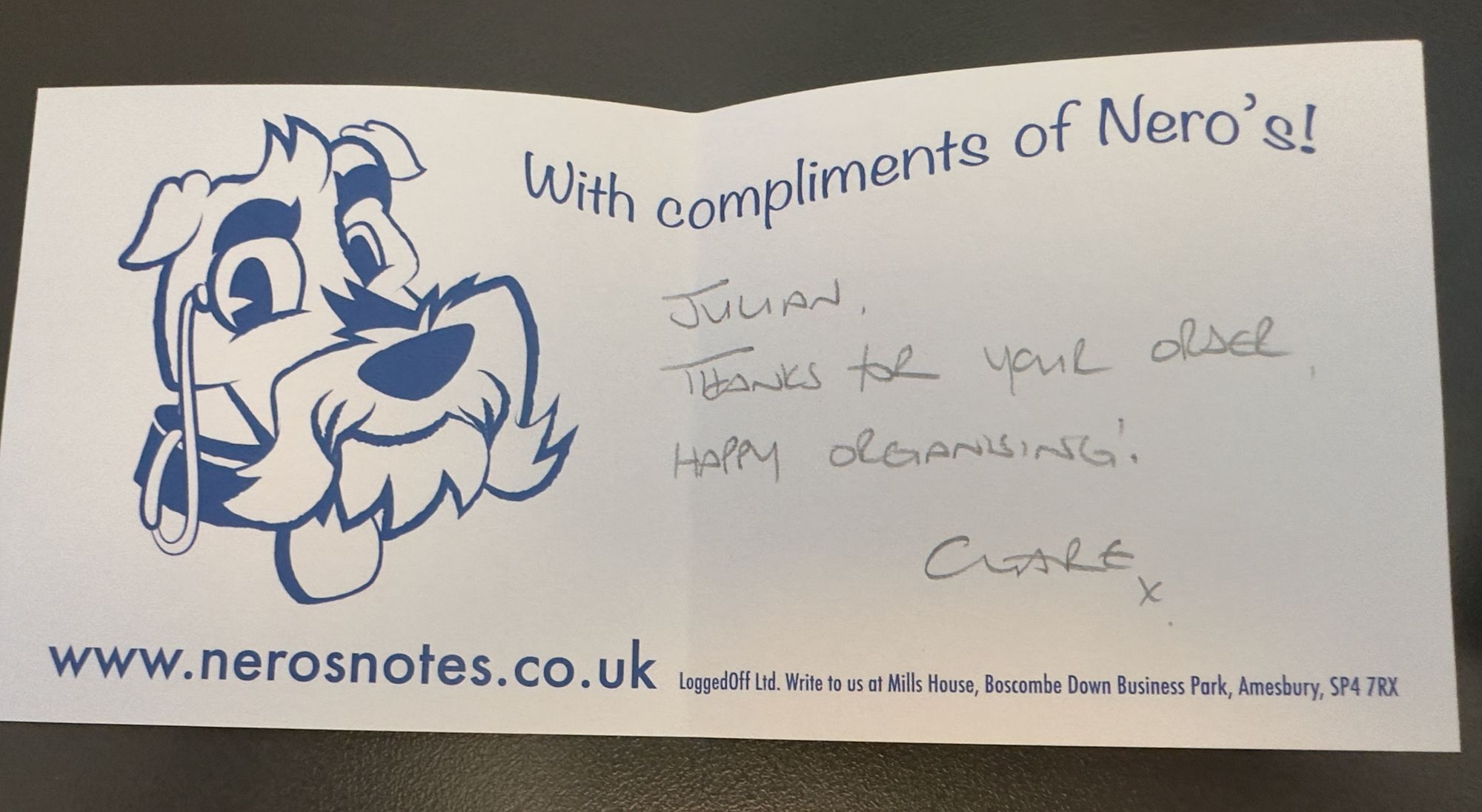 I stumbled onto Nero's sometime just before the pandemic and it quickly became my favourite online stationery shop. Once lockdown locked down, I got worried about small businesses like this, and was pleased to discover that I could take out a subscription, which I still maintain. Randomly throughout the year (it's probably not random, but I seem not to detect patterns beyond "weekly", to whit my landlord has just "randomly" taken the rent out of my account today), I get a package from Nero's. It's always addressed to something like "the magnificent" or "the amazing" Julian Simpson, which is a fun touch, and it will include pocket notebooks, pens, pencils, random bits of stationery - whatever the gang there have been recently impressed with.